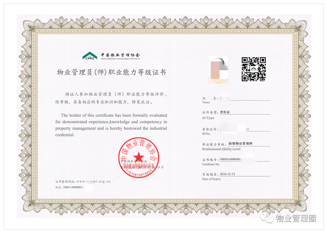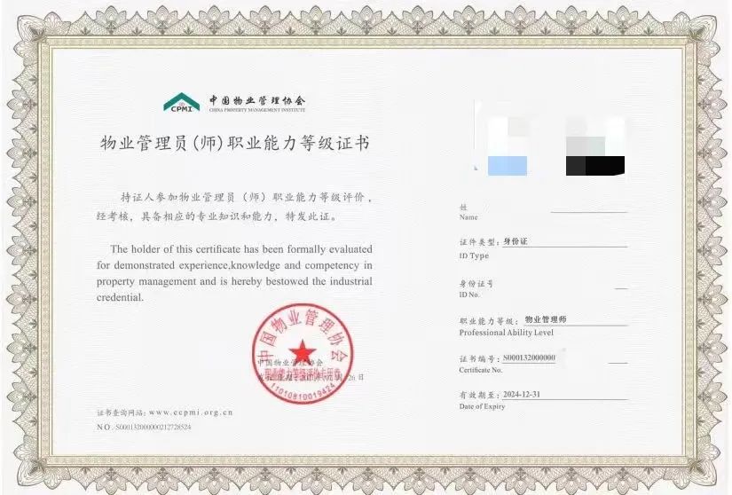 ▲助理物业管理师证书
