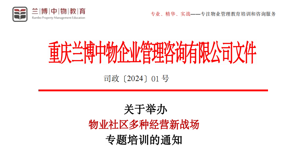 为提升物企社区多种经营能力,高效发展增值业务,结合兰博中物教育2024年的年度培训计划,兹定于2024年3月15-16日开展《物业社区多种经营新战场》的专题培训,欢迎贵司选派相关管理者参训。现将有关事项通知如下: